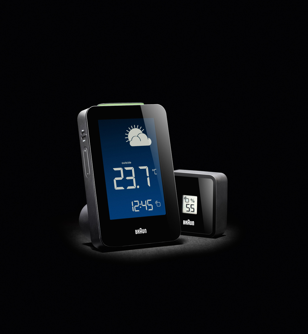 The design of this weather station focuses on easy readability and operation. Weather symbols, temperature and time are indicated simultaneously to get all information at a glance. On its right side, the station’s display can be intuitively set and personalised to indicate the individually desired information. The battery compartment serves as the base of the display, which is tilted backwards for better reading.