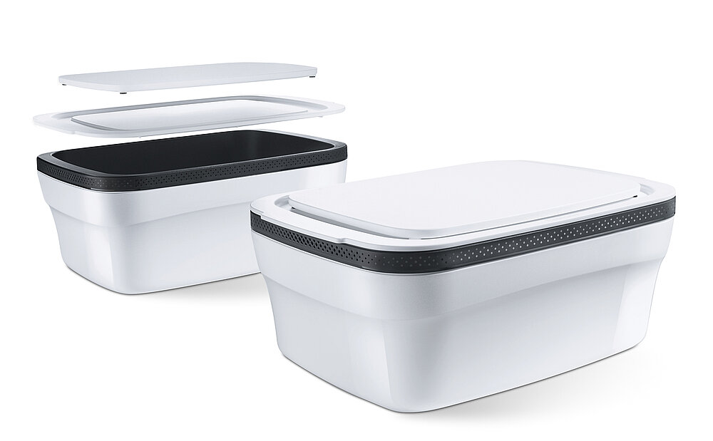 The key element in the creation of the BreadSmart II was the concept of a cover that doubles as a serving tray and allows the bread box to be accessed from the top. The product is extended by additional features such as the option to store the cutting board either inside or on top of the container. An integrated filter system regulates the humidity level inside. The slightly curved surfaces and the refined hole pattern on the rim lend the box its distinctive appearance.