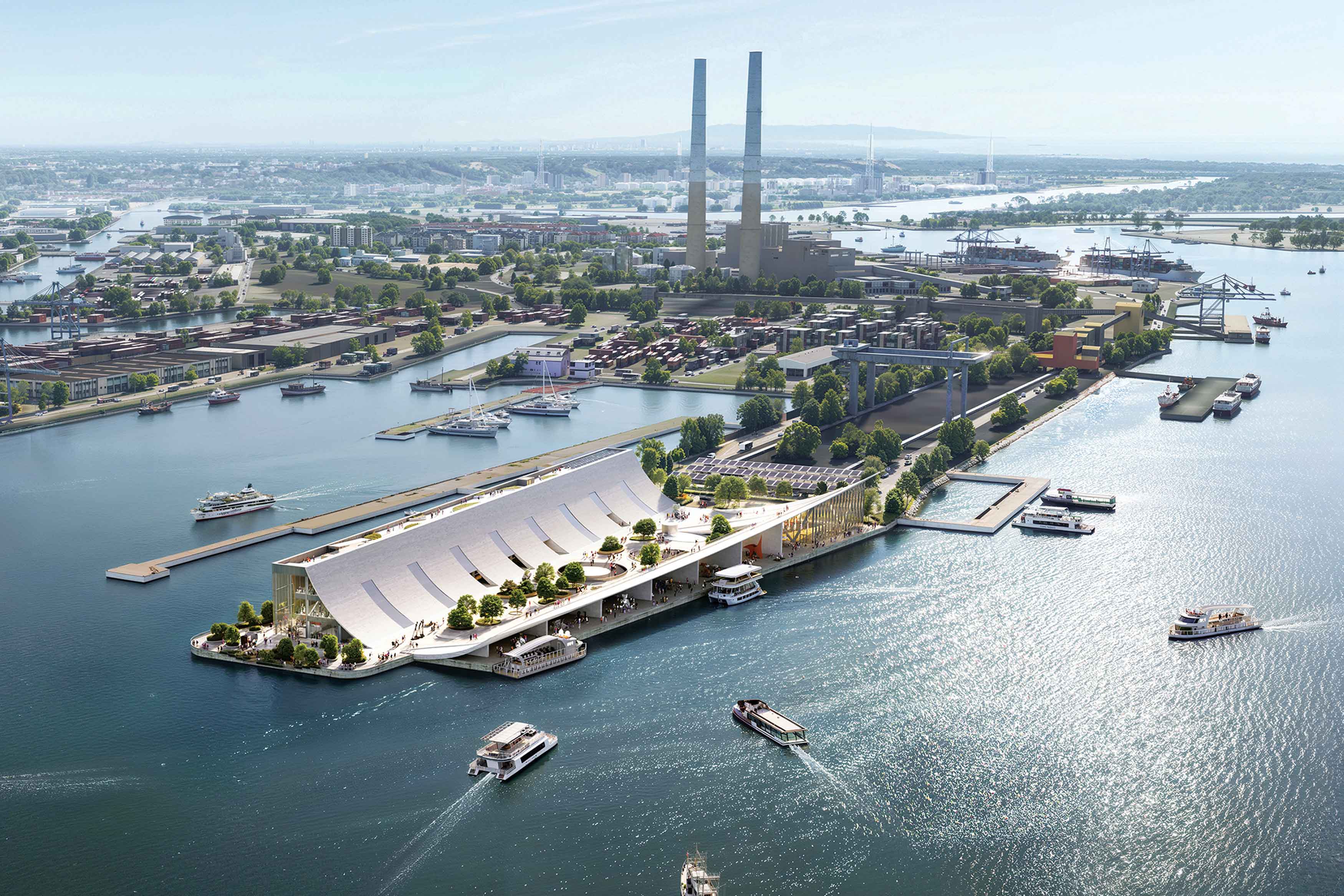 Linear exhibition spaces are organised under the original curved roof to honour the historic structure. Enclosed by a sculptural, wave-like wall, these spaces reflect the maritime context, enhance monumentality, and connect to the underground gallery.
