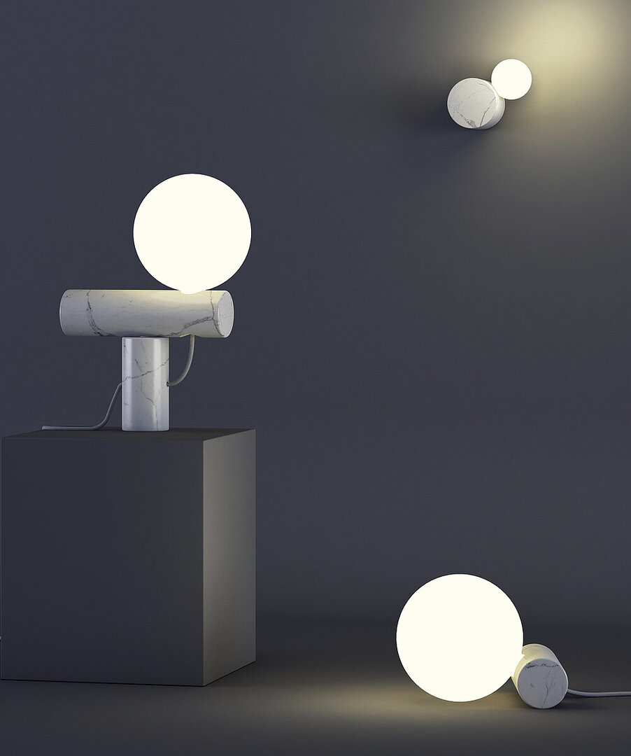 BUBBLES LAMPS are inspired by the pure shapes of geometrical spheres and cylinders. It comprises different cylindrical elements with illuminating globes, and as a whole, creates allure with the simplicity of forms. The concept of BUBBLE LAMPS is derived from organic forms found in nature. The lamps express light and volume in their purest states. The collection includes a table lamp, a floor lamp and a wall lamp iteration. Structurally, they are all made with matte white marble and opal glass bulbs. Red Dot Award: Design Concept | Concept | Illumination