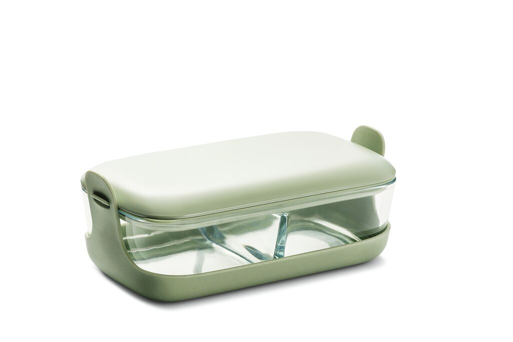 As people in China prefer to eat hot dishes, this lunch box was developed for transporting food and conveniently heating it in the microwave or oven. The dish is thus made of borosilicate glass with a protective cover made of high-temperature-resistant silicone. The sides of the silicone cover end in two handles for safely handling the heated dishes. The securely fastening lid is equipped with a ventilation valve and chopstick holder.