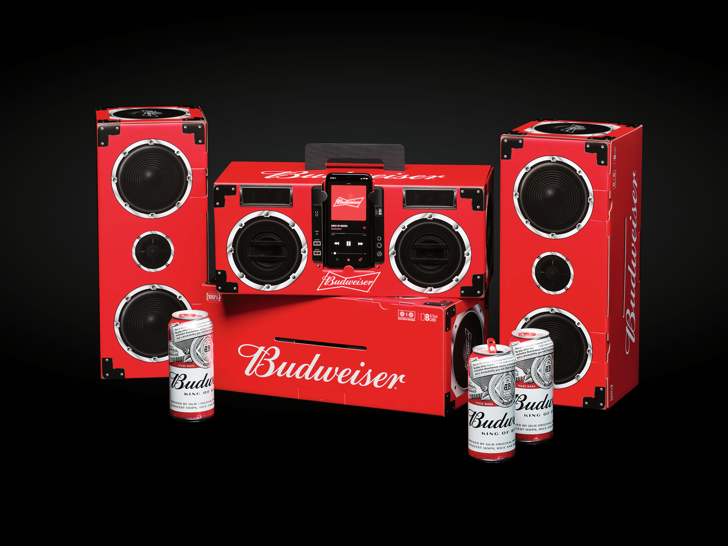 This special promotional packaging was developed as part of a summer event combining beer and music. It integrates 473 ml cans of Budweiser into a package that looks like a nostalgic boom box. The packaging is designed for use as a Bluetooth speaker, instead of throwing it away immediately after purchase. The beer boxes are made of recyclable cardboard in order to generate less waste. Each side is printed with graphics of speakers and woofers, so consumers buying more than one package can combine them to create a premium stereo sound system.