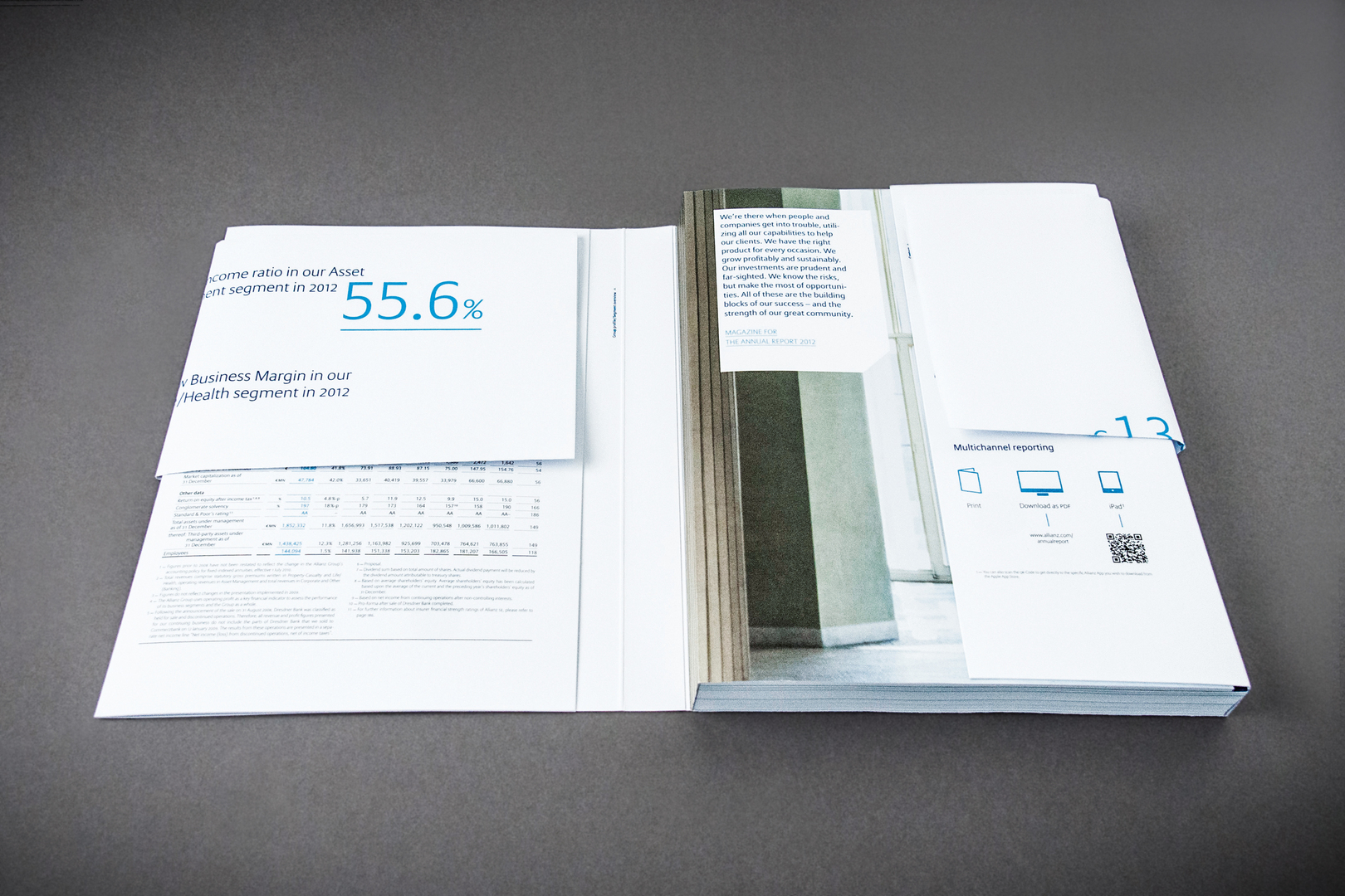 The design concept of the Allianz Group’s annual report focuses on five key objectives of the company’s business strategy and explains them in credible and understandable reports from different countries which are narrated from the perspective of selected staff members and protagonists. Various elements to communicate information such as quotations, graphics and typographic highlights convey a differentiated but nevertheless clear image of the company to its stakeholders.