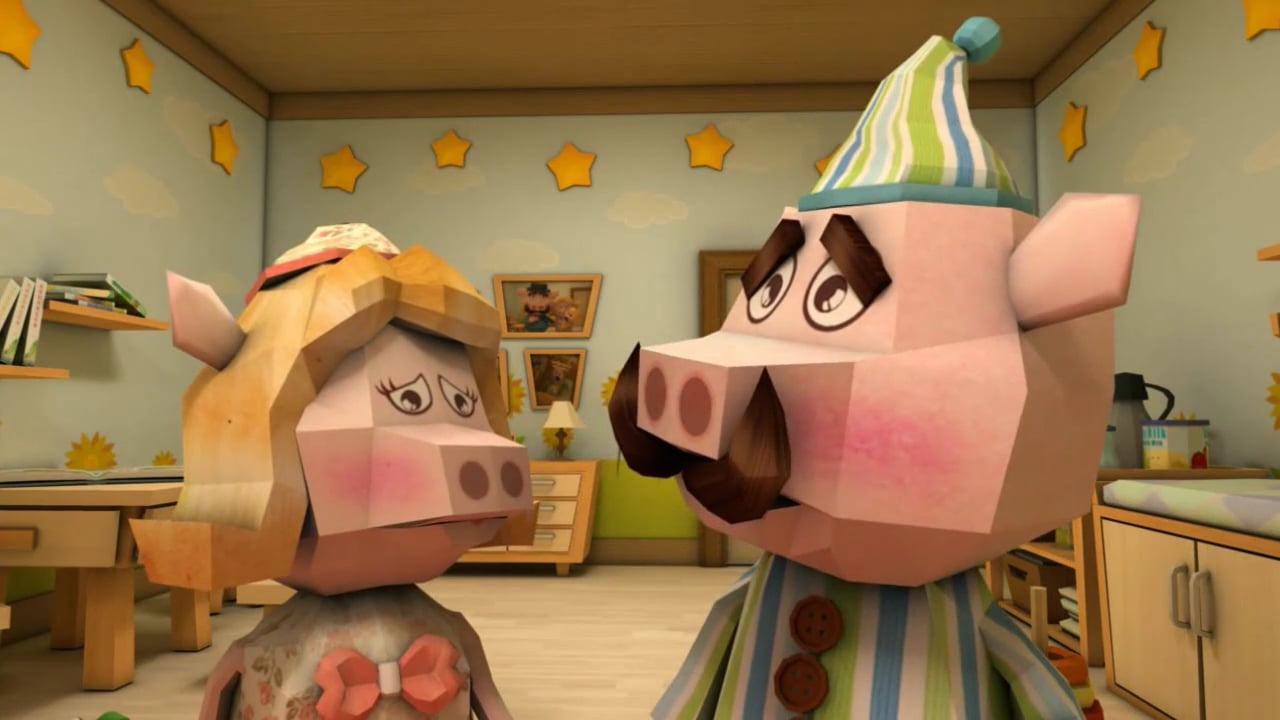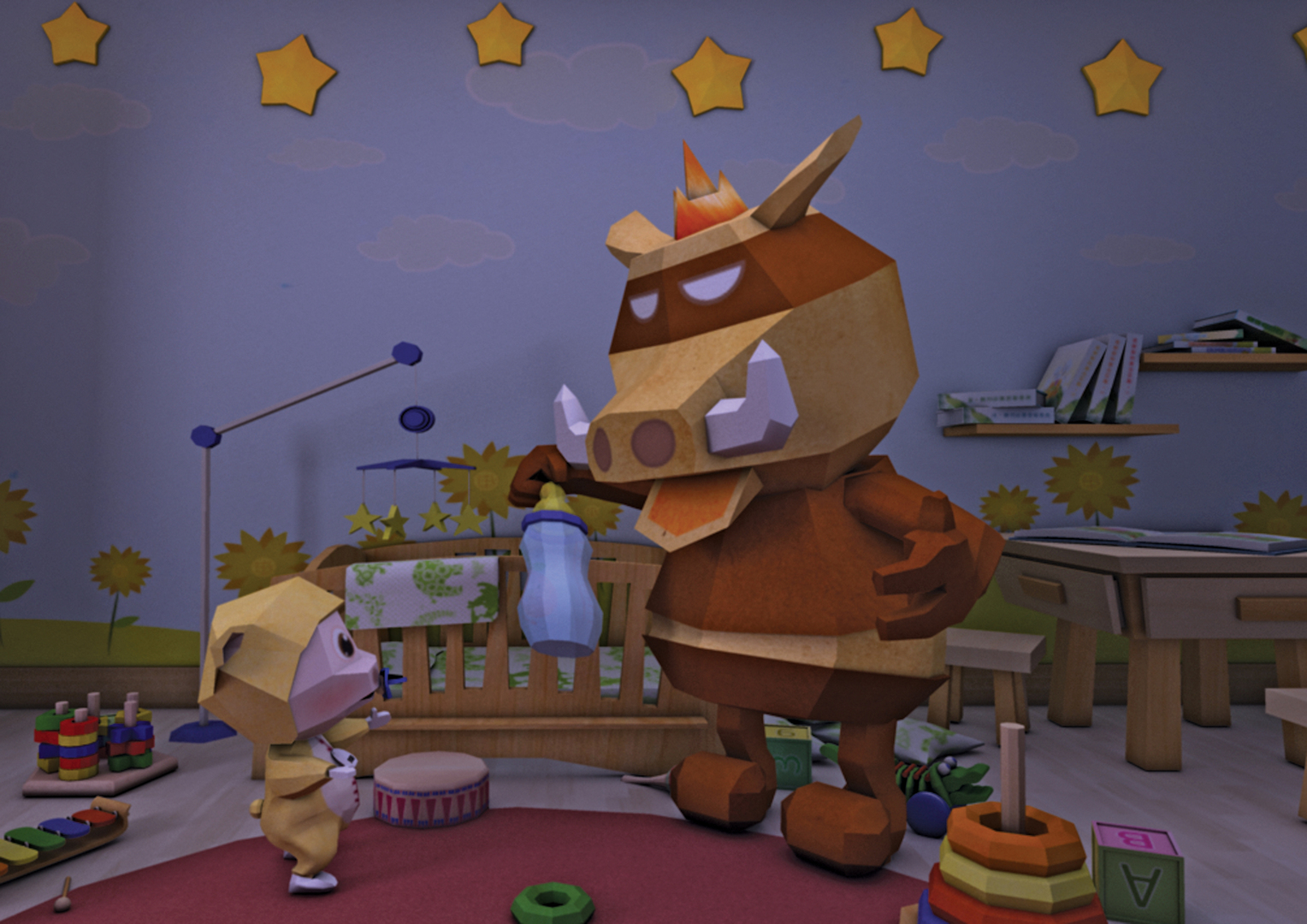 Burglar Sitter is a fresh film with 3D technology. The aim of this animation is to bring children closer to their parents through the warm and interesting story. The film is dominated by wooden materials and facet shapes. Animals, shapes and colours are fundamental learning materials for children. The scenes and characters are designed based on this principle – pigs are the main characters, for example. The animation plays with opposites; indoors, the atmosphere is warm and safe, in contrast to the cold outside environment which represents danger.