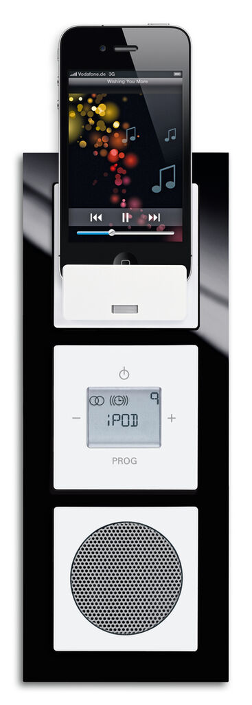 The Busch-iDock offers each iPod, iPhone or iPad a permanent place in the home. With a reserved design and various colour variants available, it harmoniously adapts to any ambient setting. The in-wall charging station is flush mounted and thus integrates into the existing electrical installation in an intelligent way. Other MP3 players and audio sources can be connected to the station via an analogue AUX input with a 3.5 mm jack plug.