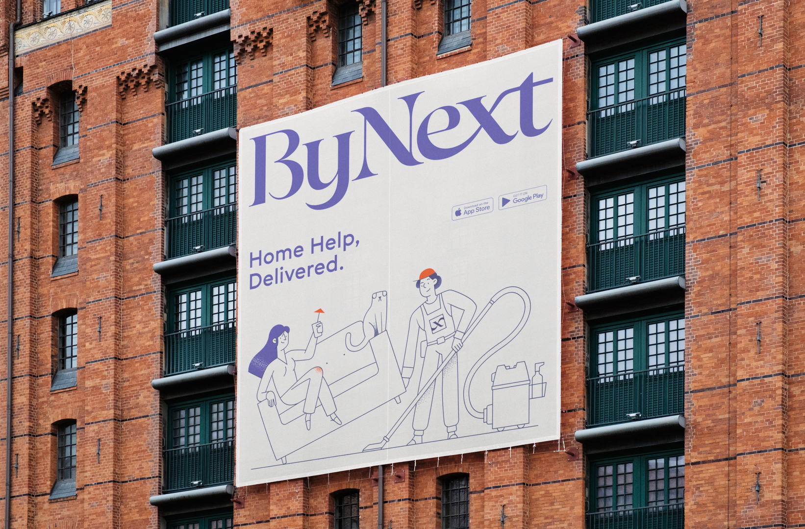 The new full-service and eco-friendly ByNext brand was established in New York as a result of the synergy between two cleaning and laundry service providers. As part of its digitisation process, the company wanted to reinvent and refresh its visual style. The logotype was designed to express the convenience of the company’s services. The flowing connections between the letters create a sense of familiarity and human touch, while extended serifs add more credibility and trustworthiness. The brand mark represents ByNext as a company that provides high-quality, affordable and reliable home help services.