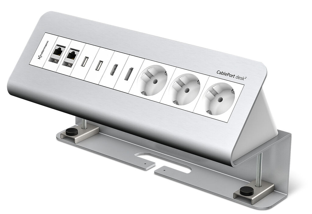 The CablePort desk² unites technology, functionality and a mature design. The aluminium body, which is bent at striking angles, gives the casing a distinctive design vocabulary. It adapts to users’ needs in the modern office world by offering numerous possible electrical and data port combinations. It can be configured individually with international mains sockets, all standard data interfaces and special multimedia solutions.
