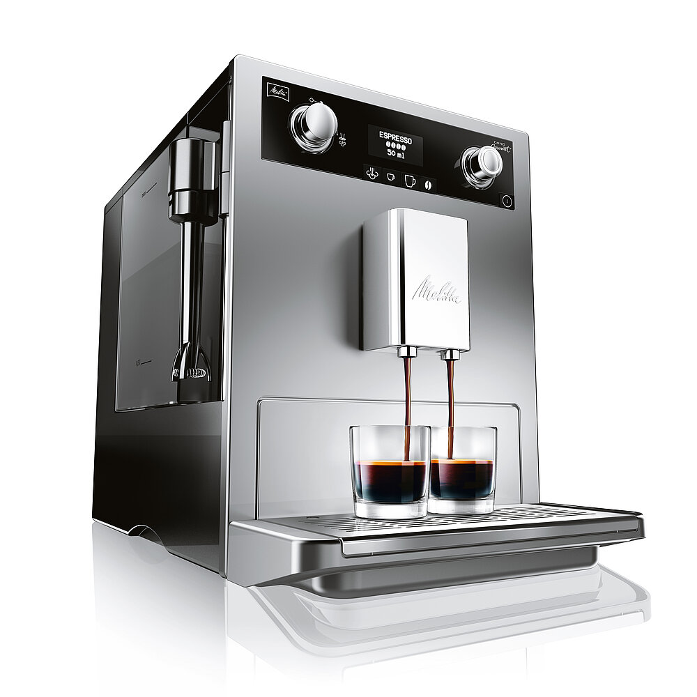 The elegant fully automatic coffee maker Caffeo Gourmet, with its patented milk froth system „Perfect Cappuccino“, prepares an exceptionally creamy milk froth. The 2-chamber bean container „Bean Select“ allows using two different types of beans. In addition, it is possible to adjust the coffee strength to any individual preference. The intuitive Rotary Switch button guarantees an easy navigation through the menu. The appliance is available in silver and high-gloss black.