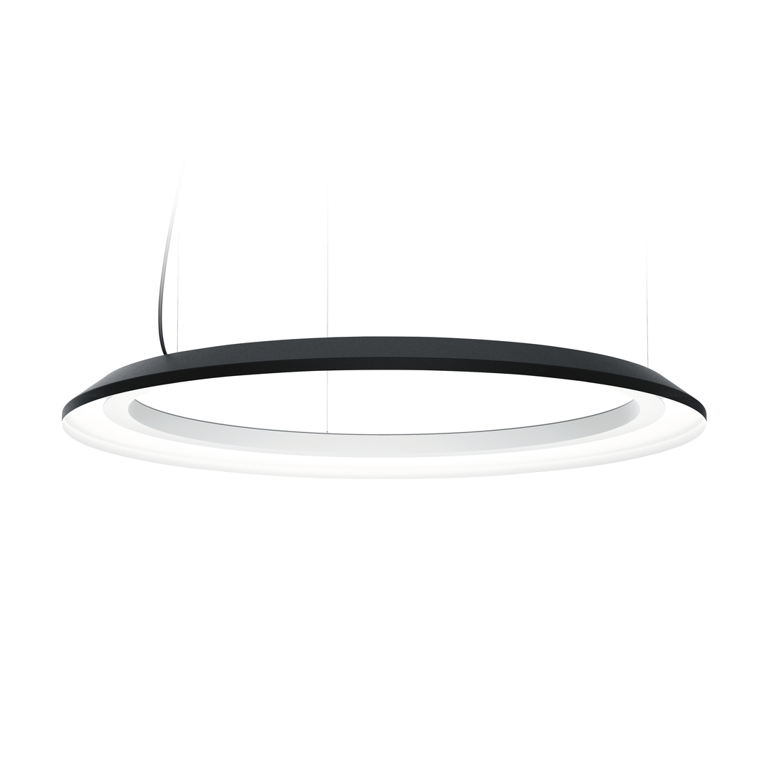 The soft reflected lighting of the ring-shaped Caldera luminaire creates a halo effect. To offer flexibility, the luminaire is available as a pendant or surface-mounted luminaire with different diameters in matt black or white. The combination of several luminaires creates individual arrangements that blend into both commercial and private settings. The slim silhouette is complemented by a discreet mounting plate which makes the luminaire suitable for rooms with a low ceiling height.