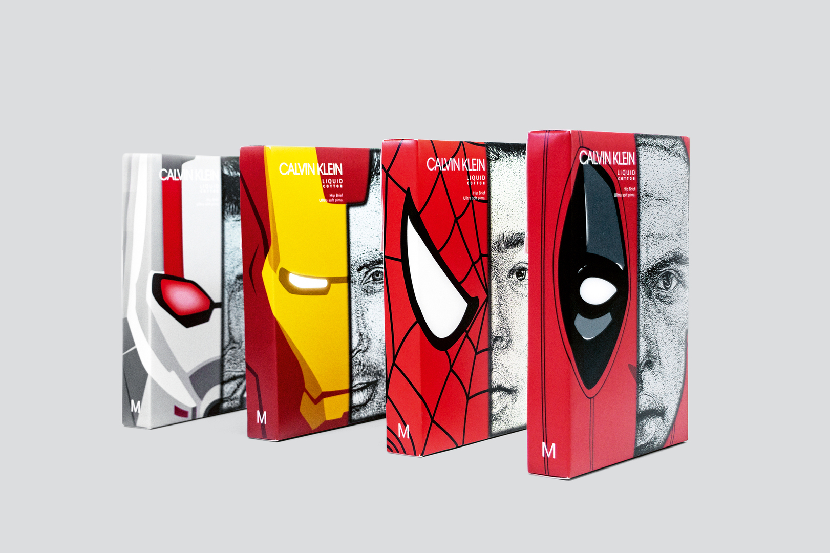 This experimental packaging design for Calvin Klein underwear aims at targeting “Otaku”, fans who invest a lot of time and money in their passion, between the age of 18 and 38. In order to communicate the brand’s image as sexy, perfect and artistic, as well as to convey a positive energy to consumers, the design features four superheroes from the Marvel universe. Each package shows a head composed of the mask of Iron Man, Spider-Man, Deadpool or Ant-Man, alongside a black-and-white illustration depicting male faces of different ethnic groups.