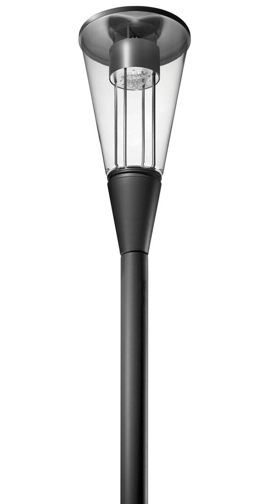 The conical body of the Campone streetlight has a straightforward linear design. The transparent enclosure houses the optics and can function with either conventional or LED lighting. Special design elements (large light cover) enable optimal heat management which ensures a long bulb life, particularly in case of the LED configuration. The shadow-forming groove at the interface between the lighting enclosure and the mast highlights the simple lines of the streetlight.