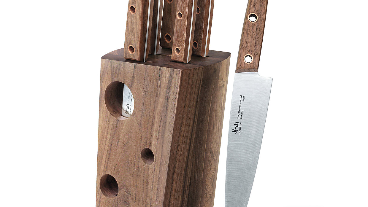 A distinctive hollow-handle design characterises this series of knives. All knives are forged from a single piece of metal which ensures easy cleaning and long-lasting durability. The contours of the handle are aligned with ergonomic requirements and ensure a firm and comfortable grip. The precisely manufactured knives also meet with the demanding requirements and the quick pace of a commercial kitchen environment. The set comprises five knives that are housed in an asymmetrical and beautiful wooden knife block.