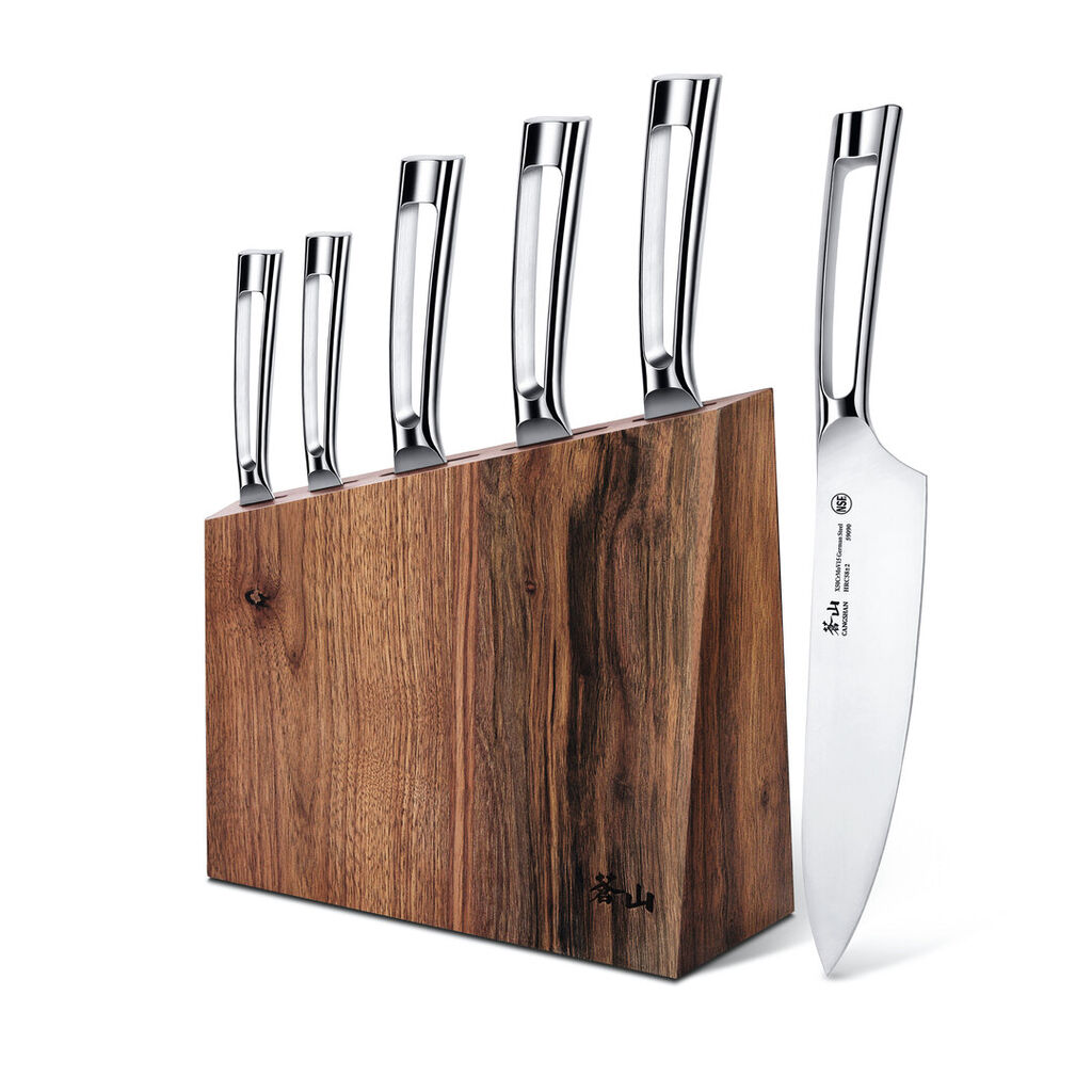 These high-grade kitchen knives in combination with the elegant wooden knife block yield an appealing as well as autonomous overall appearance.