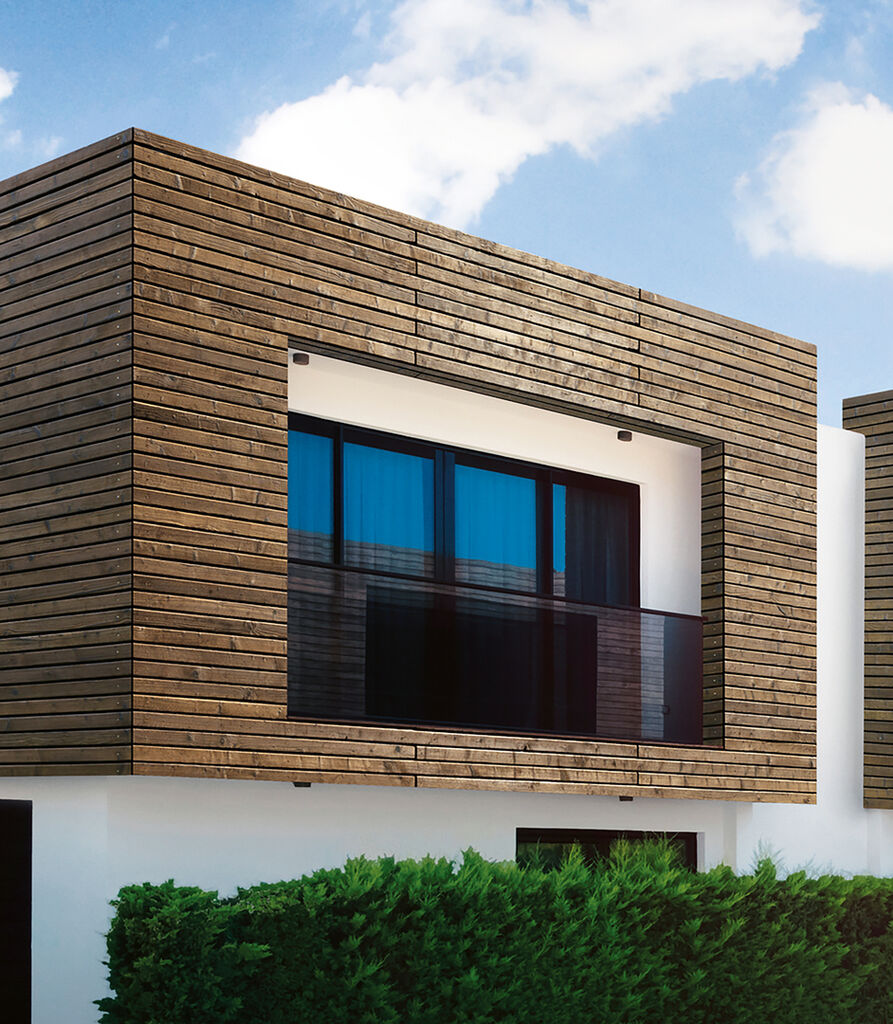 Carboset10 is a high-quality wood panel facade that was manufactured using a new development of the traditional Japanese wood finishing method called Yakisugi which works with fire. The first step is to carry out a controlled burn of the upper layer of a Douglas fir; the next consists of brushing off the layer of ash. While the carbonised material remains on the hard growth rings of the wood, the softer areas exhibit indentations of a markedly lighter colour. The resulting relief gives facades a distinctive appearance. By applying a wood glaze, the durability is additionally enhanced.