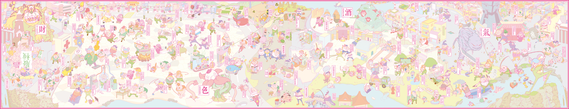 The illustration Cardinal Vices stands out with its unusual format in the style of a panorama image. And thus, similar to a panorama image being characterised by a wide viewing angle, this illustration paints a detailed picture of current events in Taiwan’s society. The main topics are wine, sex, avarice and temper. They are represented by interesting characters in a fresh style. The colour scheme is dominated by pastel hues such as light blue, light green, purple and pink, which creates a friendly impression and a contrast to the content. The illustration captures the daily life of ordinary people in Taiwan and wants to get viewers involved in this virtual world with empathy and understanding.