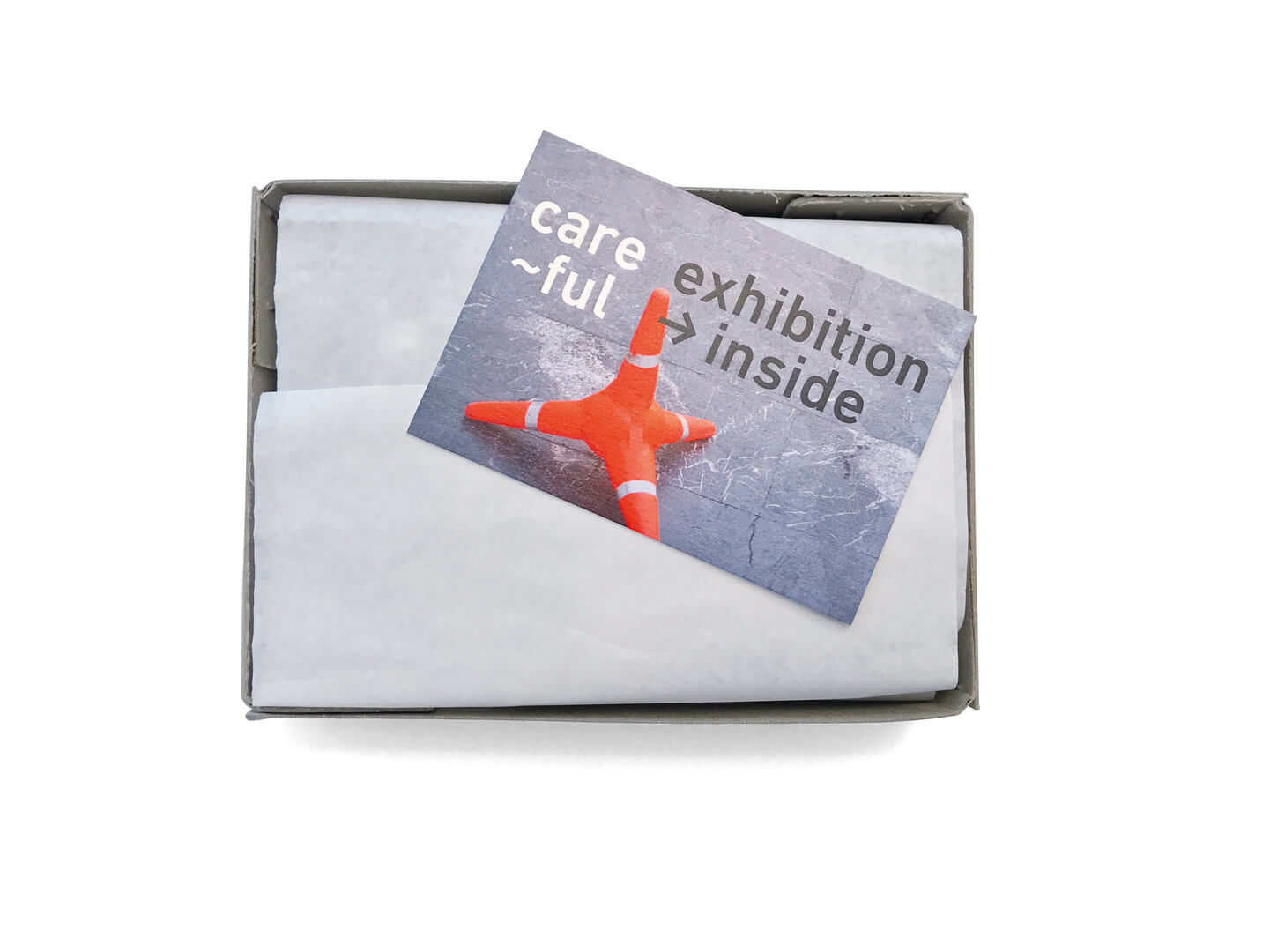 This exclusive set, produced as self-marketing for the agency mind the gap!, comprises a booklet wrapped in tissue paper, cotton archive gloves printed with “care” and “~ful”, a cover card and a box with a catch seal. The cover and box are made of gray cardboard reminiscent of archive boxes. Numerous images run across pages, creating the impression of one’s moving through an exhibition. The set’s title emphasises that the agency’s services focus on all aspects of exhibition design for its clients. A corresponding app offers further in-depth information.
