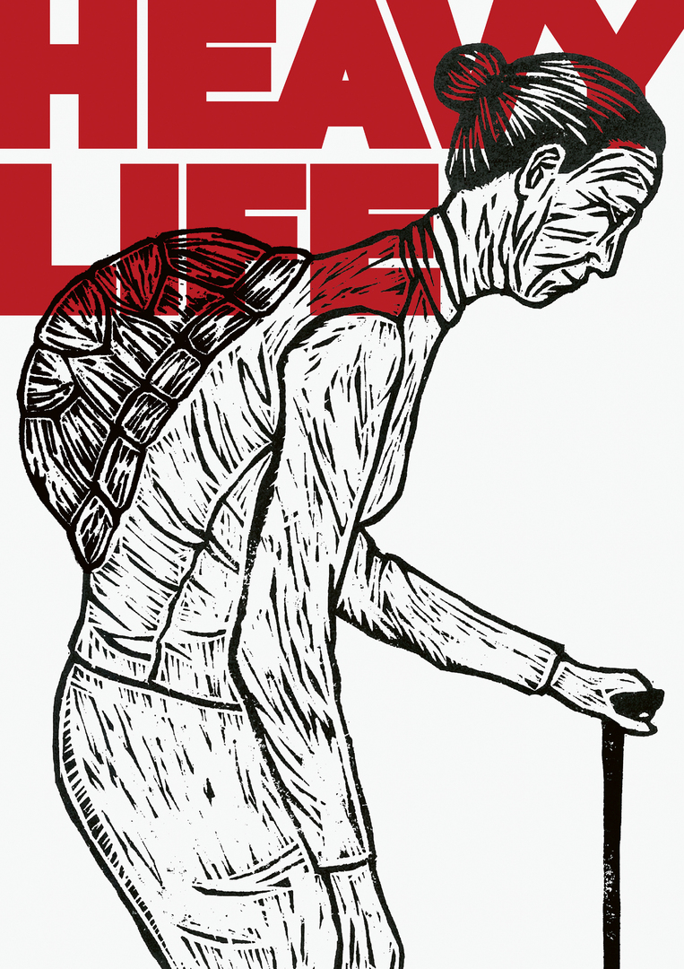 In this poster work, two large-size human figures draw attention to the problems old people face in their daily lives. A snail and a tortoise are used as metaphors for the burden of limited mobility which comes with age. Designed as woodcuts, the black-and-white images exude a vintage feel, while the bold red lettering seems to weigh heavily on the figures’ shoulders. By this means, the posters effectively express a compassionate attitude, implying that we should be more attentive to elderly people.