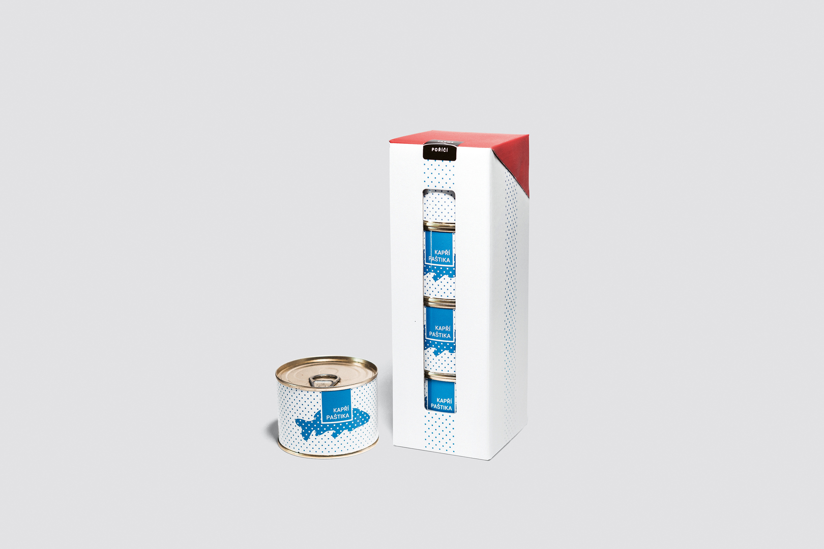 This cardboard packaging for a carp pâté, created for a local Czech business, is designed to perform several functions at once. Its innovative opening method minimises the packaging dimensions and the amount of material used. Thanks to its square shape, the box can later be repurposed as a gift item. In addition, this facilitates easy shipping for e-shops, as well as efficient storage without requiring more space. The straightforward graphic design makes the traditional cans highly attractive and also instantly recognisable on shelves.