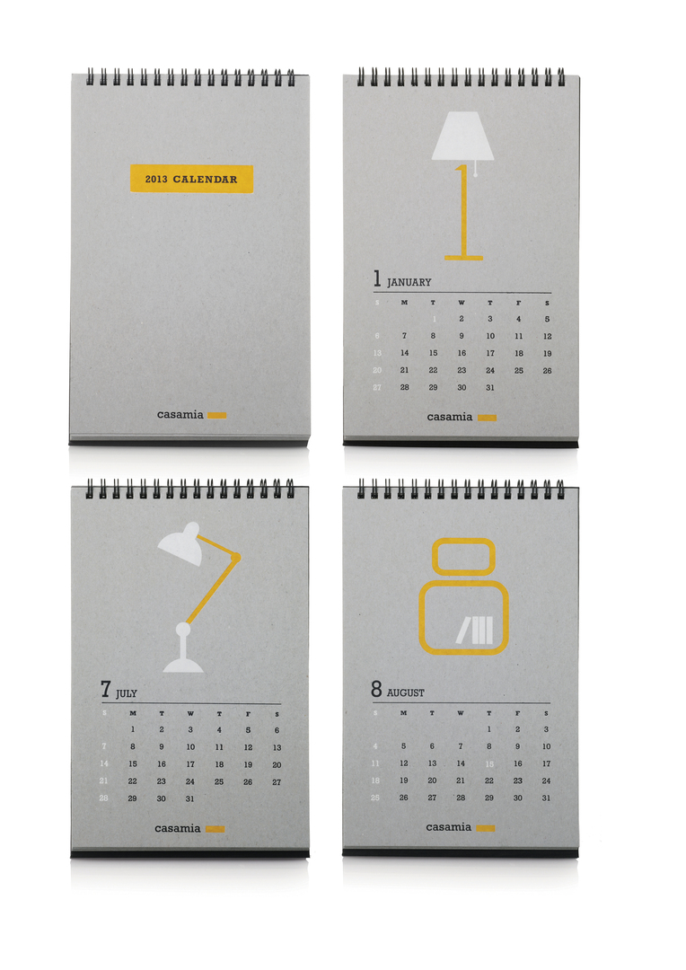 The Casamia calendar 2013 highlights the products of this company by visualising their integrative possibilities. An exemplary item was chosen for every month and presented in illustrations using only two-coloured lines. The silhouette of the simple products (in white) together with the digits signifying the respective month (in yellow) indicate the period of time people spend using the products of this brand. Underlining the company’s sense of ecological responsibility, the calendars have been printed on paper with a wooden appearance.
