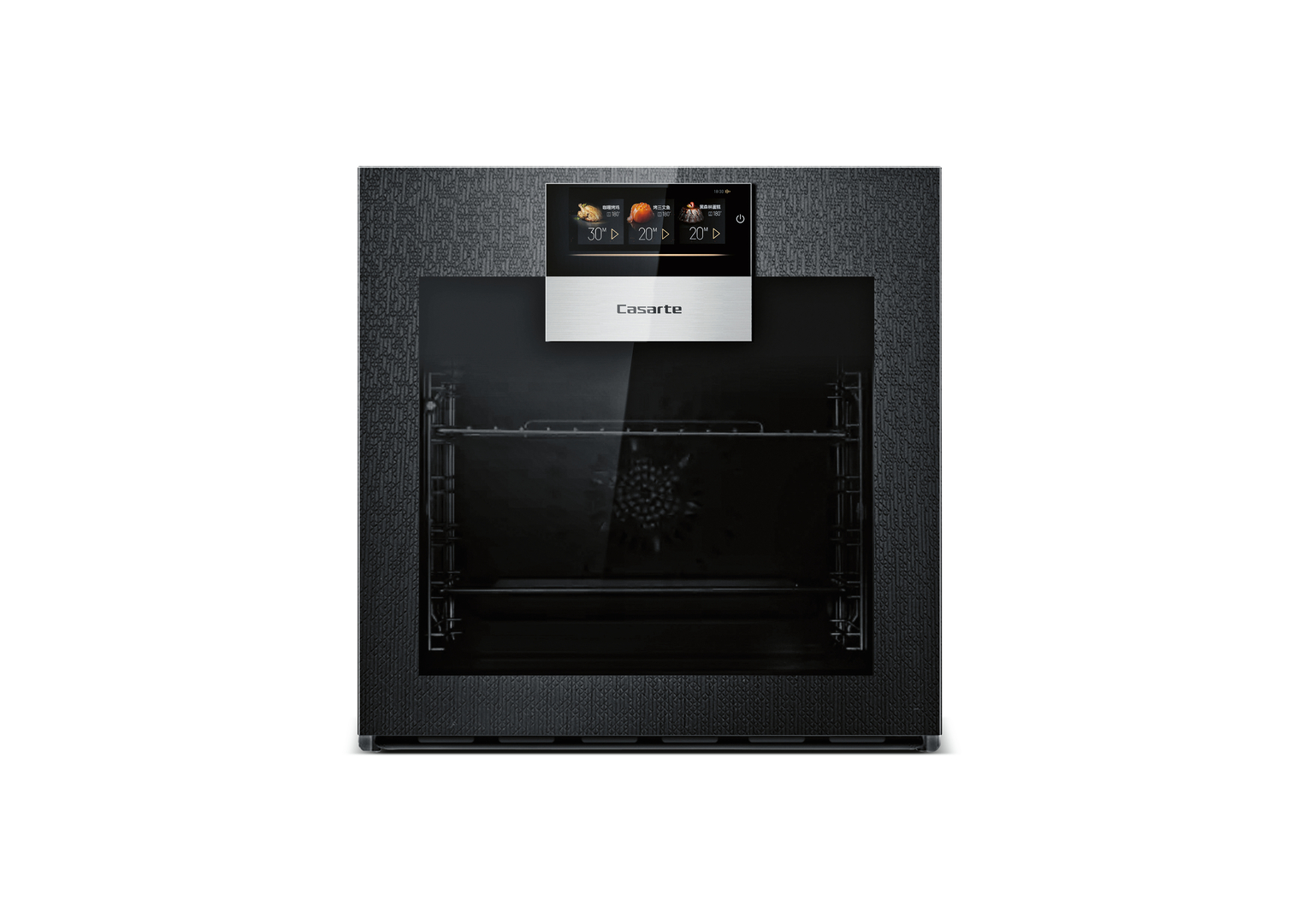 The IoT-ready built-in oven impresses with its interesting front design that combines an aluminium alloy with tempered glass. The dark cyan colour of the surface emphasises the high-quality appearance. The oven door is equipped with a high-resolution TFT display which helps the users to prepare food. The functional layout of the interior and the lower air outlet also promote user-friendliness.
