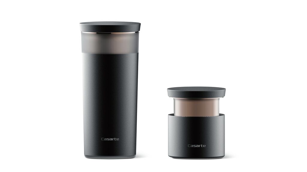 The Casarte Juicer Cup is a wireless and portable mixing cup that allows users to prepare fresh fruit and vegetable juice anytime and anywhere. For this purpose, the copper blades and the motor are integrated into the lid, which also contains the control switch. The elegant appearance is achieved by minimalist lines. The dark colour scheme enhances the appealing look. An additional cup can be used both as a drinking vessel and useful storage space for the mixing attachment.