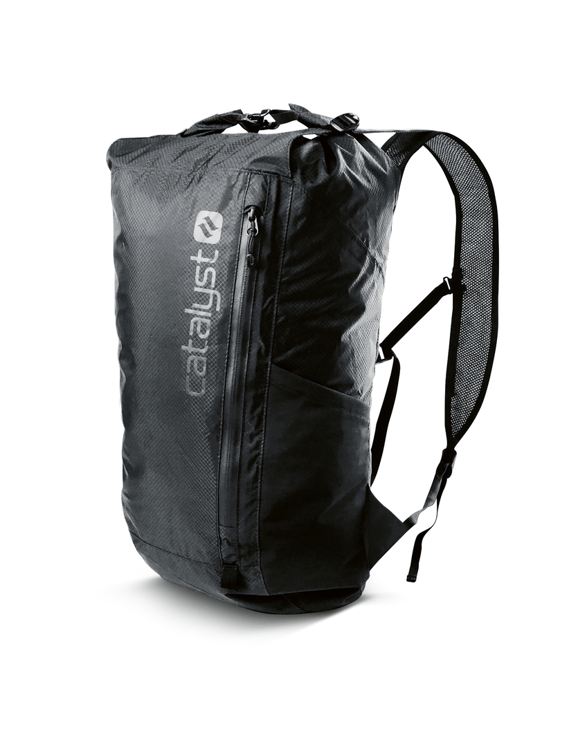 This extra light backpack has a water pressure resistance of 10,000 mm and comes with taped waterproof seams. The backpack can be folded up small and stowed in its carrying pouch. A breast strap with whistle is attached to the breathable, quick-drying shoulder straps. A water bottle fits in the side pockets, while the roll-top closure helps to store bulky items. The tapered overall profile ensures that the load on the back is distributed evenly.