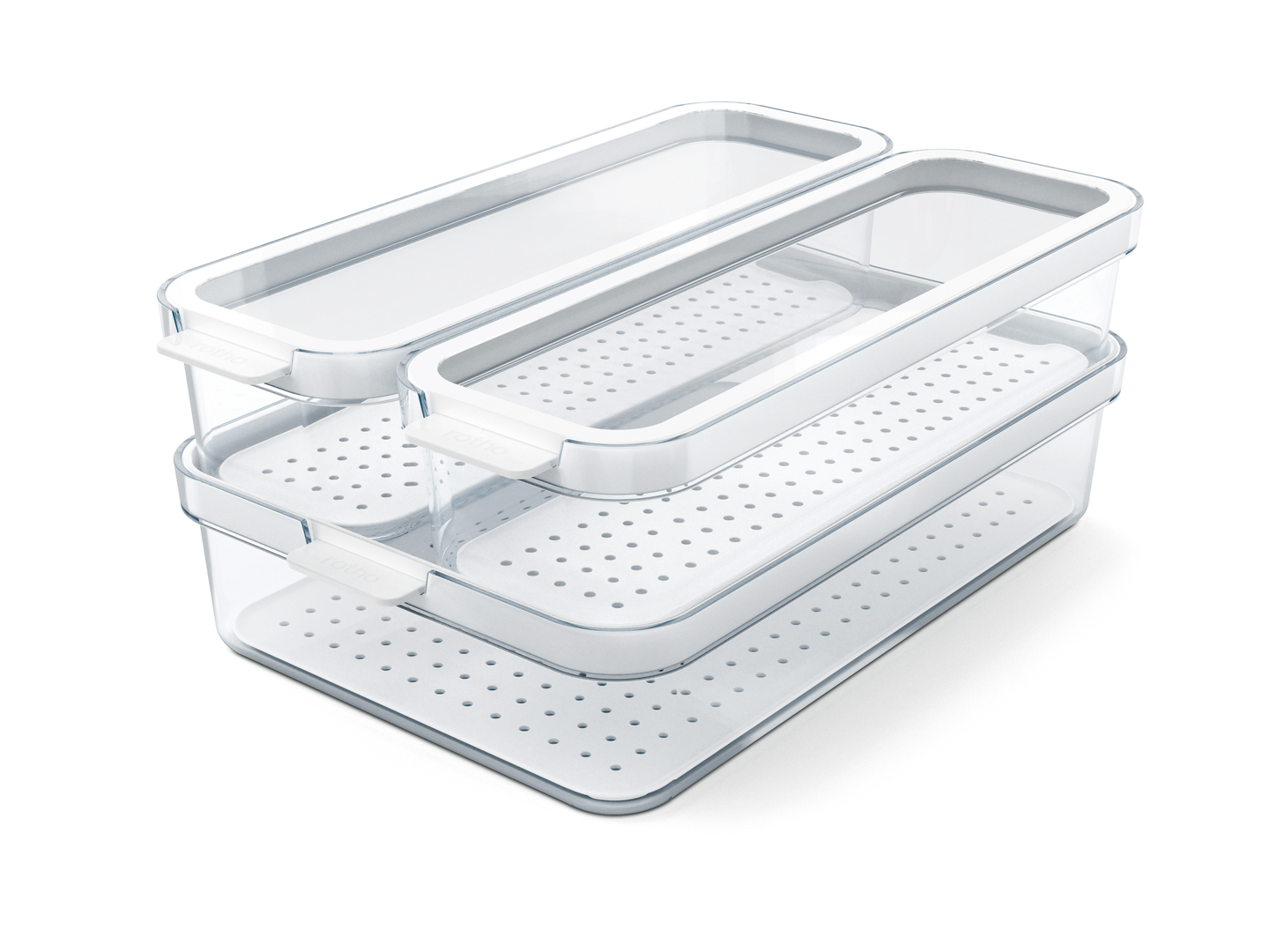 With the refrigerator containers of the Cauma line, food can be stored in a space-saving and clearly arranged way. Turned the other way, the transparent lids can be used as a shelf for other goods or for stacking the individual elements. The containers have a drip tray that prevents fruit and vegetables from lying in their own water or juice, which prolongs the shelf life of the food. “The Cauma containers are practical and functional. Transparent and white plastic materials underline the clear design language,” the jury agreed.