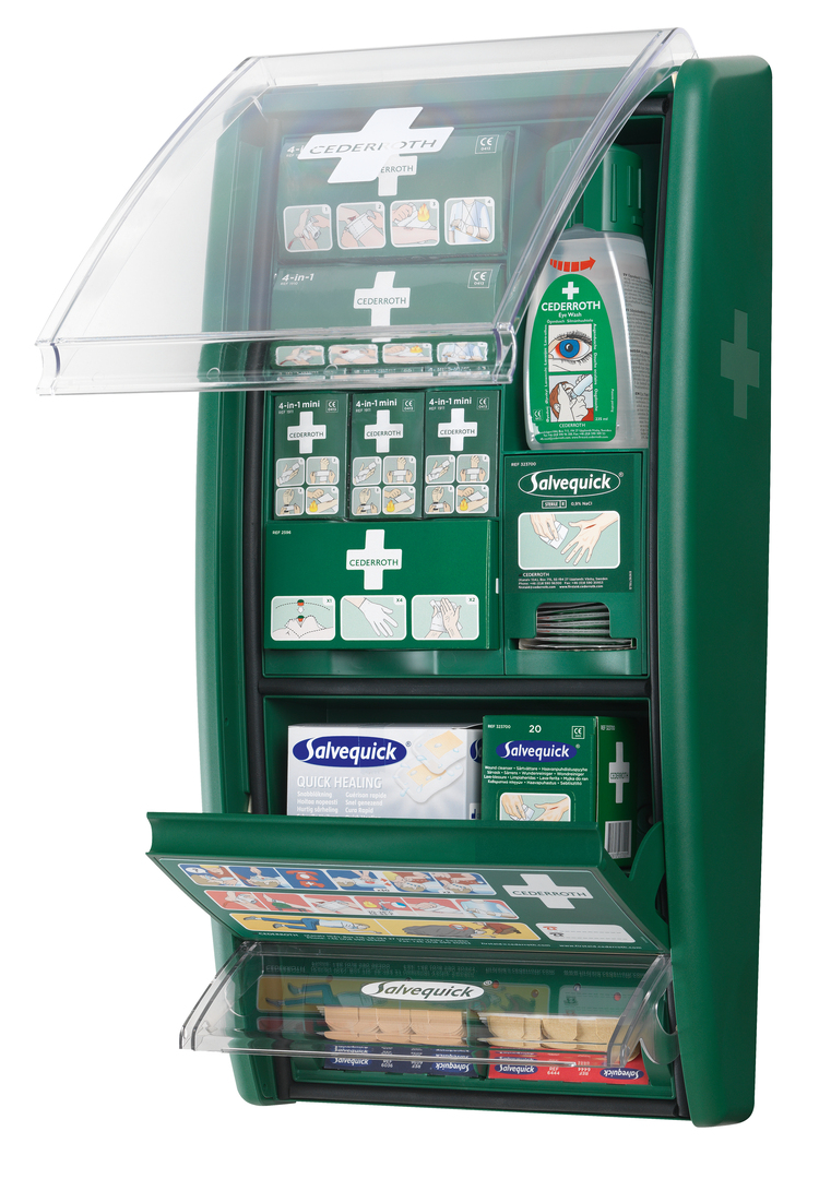 This first aid station geared to workplaces presents a quick overview of all included products to be used for emergency care. The products are clearly visible and protected against dust and liquid splashes, keeping them hygienic and clean even in dirty work environments. The station also contains an extra storage unit for adding products tailored to the specific needs of individual workplaces. All medical supplies come in functional packaging and can easily be refilled. Plasters, for example, are provided inside a convenient dispenser. When one is pulled out, the protective paper is automatically removed so that the plaster may be applied with just one hand. Furthermore, clear and easy-to-understand colour illustrations on the outside of the station explain essential first aid techniques.