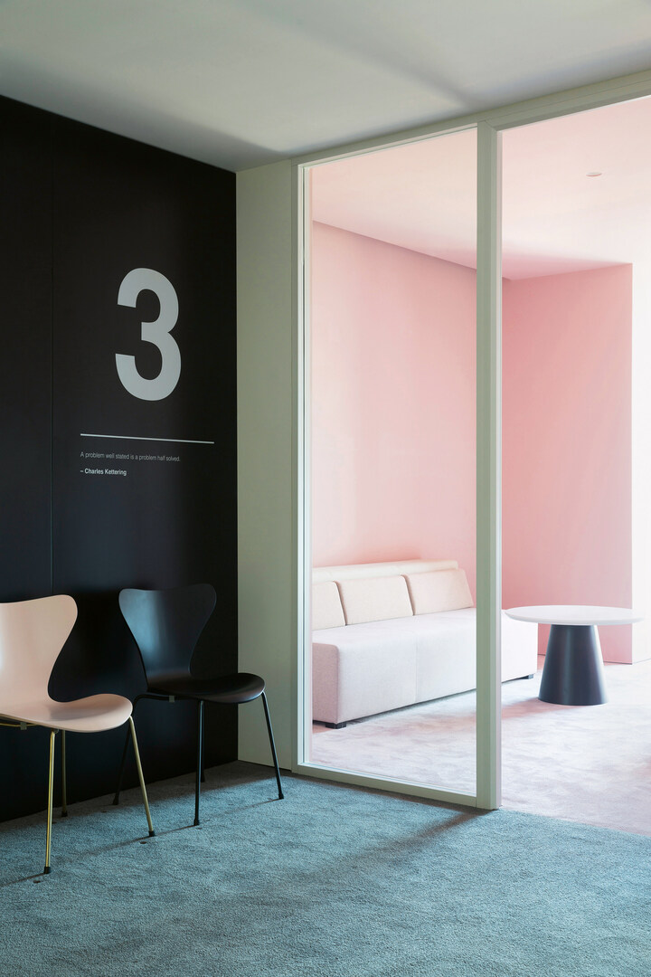 The interior design concept for these office rooms, which occupy four floors of a building, is based on the use of “boxes” to divide the space up into different functional areas such as reception, meeting rooms or private workstations. Each box has its unique spatial proportions and dimensions and elicits different emotions. The yellow work box, for example, offers an immersive experience of space. Sound absorbing materials on the floor, walls and ceiling here have a calming effect and help to improve work efficiency.