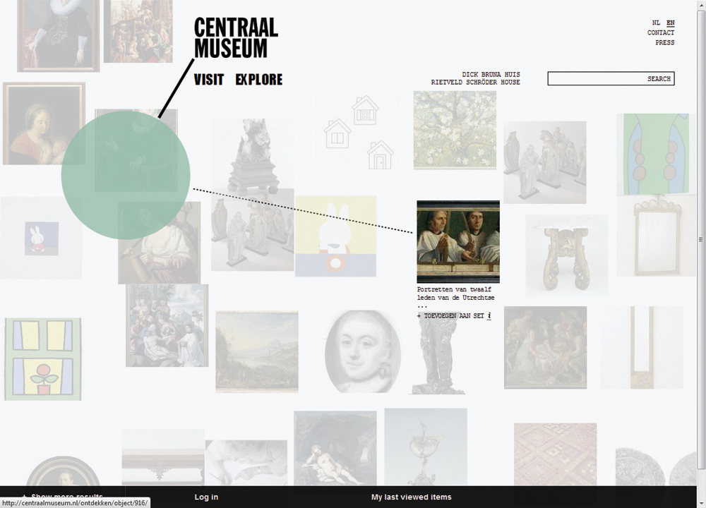 “Discovery” is the central theme of this website for the Centraal Museum in Utrecht. The site encourages users to create their “own” Centraal Museum by storing individual objects from the collection, combining sets and adding the corresponding description. In a tagging game, everyone is challenged to name as many keywords for each exhibit as possible. The information on the website is justified to the right, thereby positioning the logo at the centre of the page and displaying the collection on the left-hand side at all times.