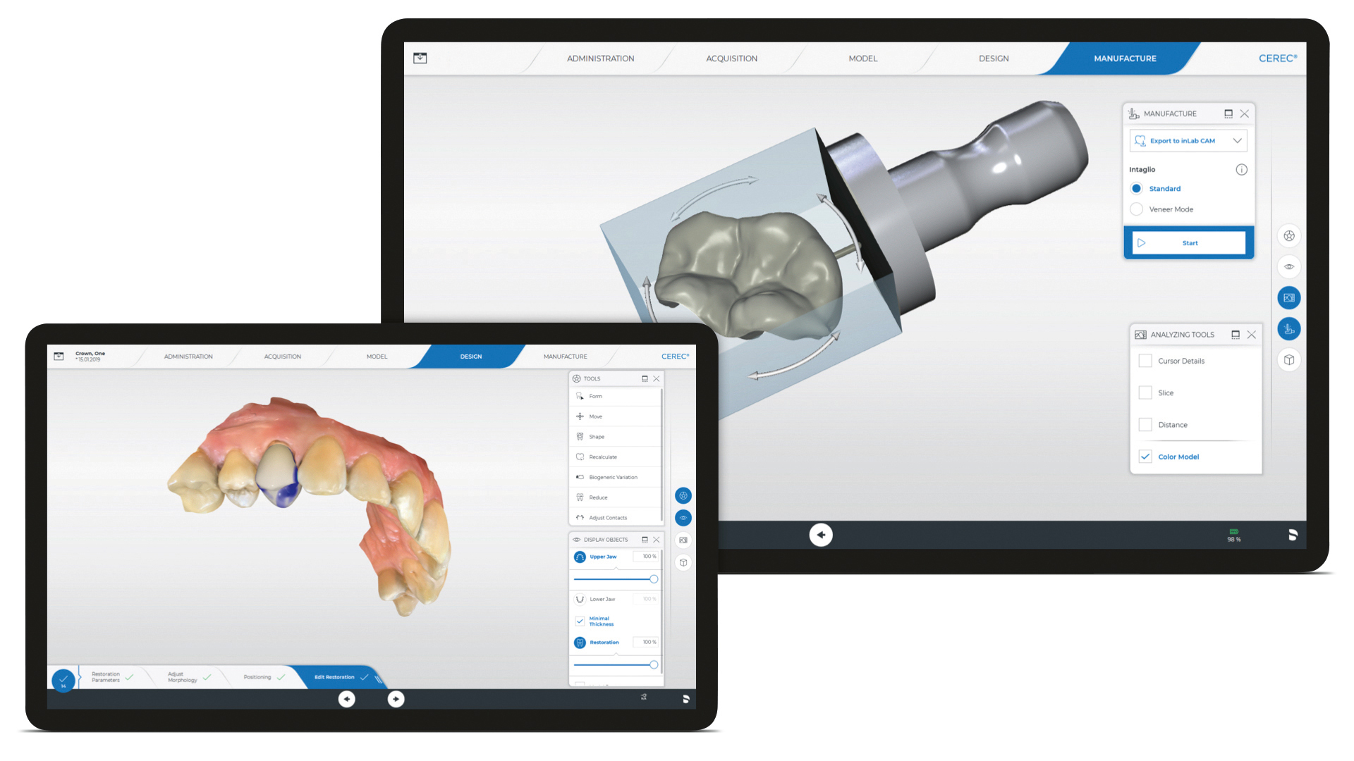 The CEREC system enables dentists to prepare, design and produce dentures in just one session, sparing patients several appointments. The UI design combines photorealistic 3D renderings of jaws and teeth with a user-friendly interface and clear navigation structure. Together with the overall redesign, effects and animations have also been optimised in order to display both relevant information and 3D models of teeth and jaws on the work surface in a clearly organised manner. The system with touchscreen is intuitive to operate.