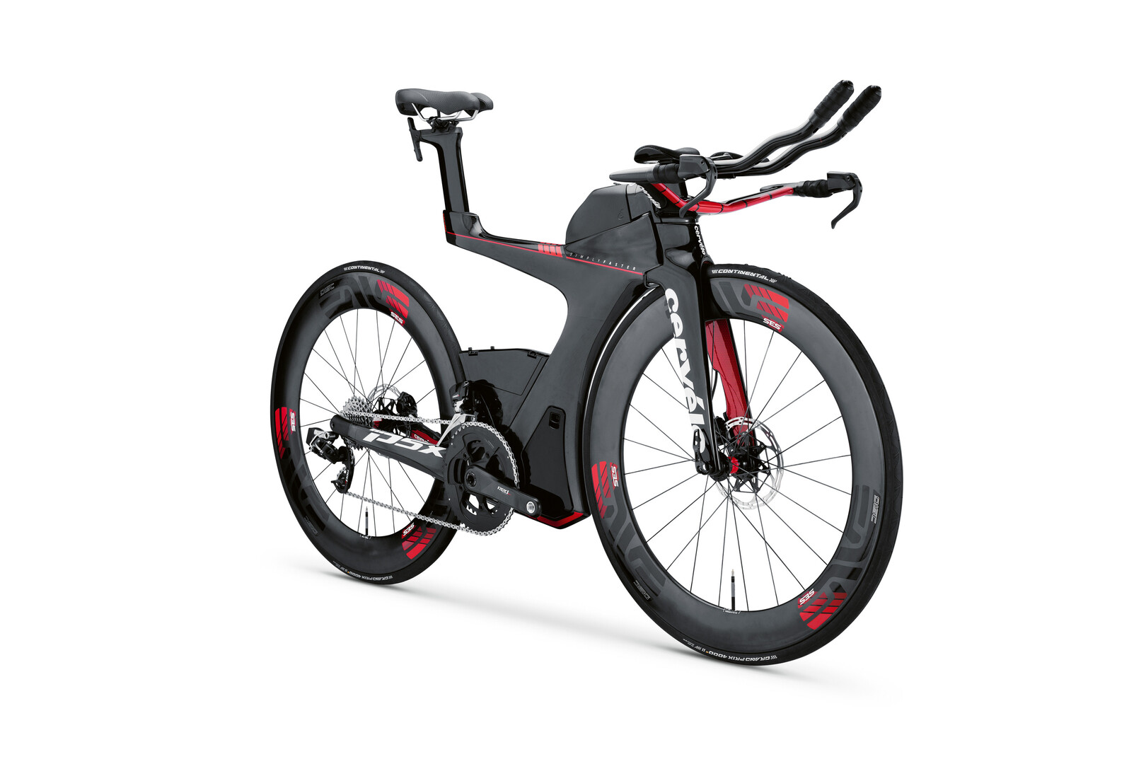The development of the new Cervélo P5X was preceded by extensive research into the racing and training environments of triathletes. The result is a bicycle which has neither a seat tube nor any seat stays. The spectacular shape of its frame attracts attention. It features SRAM S-900 HRD disc brakes, which are controlled by a hydraulic pipe. After more than 180 hours of wind tunnel testing in a full Ironman setup, it is aerodynamically an average 30 grams faster than its predecessor P5. The eye-catching Smartpak, Stealthbox and Speedcase components securely store important items during the competition and are easy to remove.