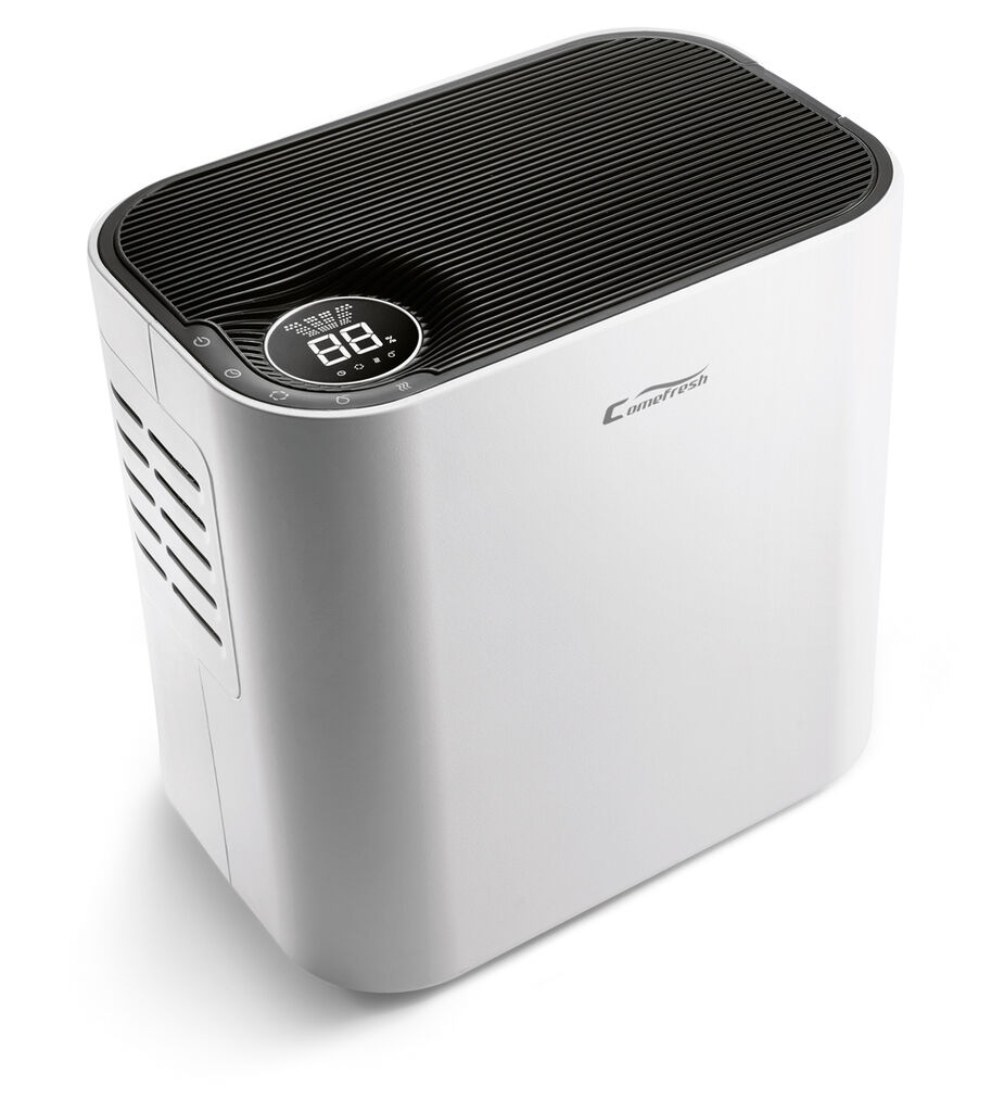 The compact CF-6600 air washer is suitable for simultaneous air filtration and humidification. It features an intuitive LED display, a waterproof control button and storage space for the cable. The black-and-white device, manufactured to 90 per cent from recyclable ABS plastics, renders a smooth impression with its rounded edges. The ventilation opening situated at the top of the device underlines the harmonious overall impression.