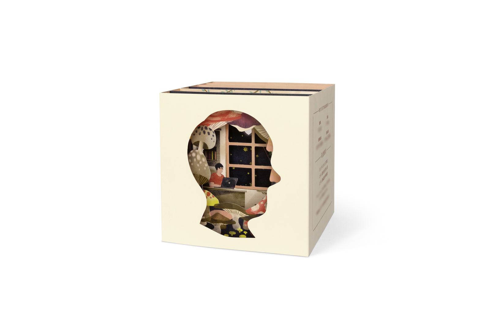 This shadow box wedding card is designed to be viewed in two ways – in a flat version, which can be sent by post, and as a pop-up box. Lying flat in the silver-coloured envelope, one side shows the portrait of a bride, while the other shows the portrait of the groom. Once it is folded into a paper cube, this hollowed-out card opens up layer upon layer. It has double-sided views where each side shows the memories of the bride and the groom in chronological order. The sophisticated illustrations of the motifs for the individual cards show scenarios from the past, the present and their common future. The heart at the centre visualises the rendezvous which brought the two together and has kept them together ever since.