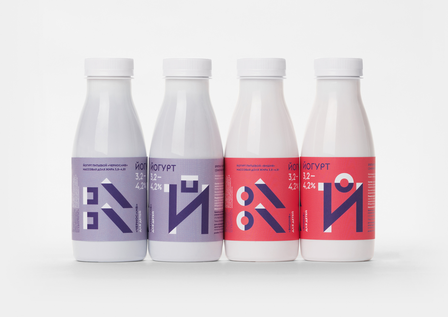 The packaging concept for this yogurt range takes into account the cognitive abilities of children from the age of three. Children discover the world through simple forms and are better able to comprehend abstract, simple and geometric shapes and colours. The idea behind the design was that the word “yoghurt” in Cyrillic starts with a specific letter with a diacritic on the top, which can be drawn in different graphic shapes. Thus, it became possible to show different flavours of yoghurt: cherry, prune, pear, peach and others. The colours and abstract shapes are reminiscent of these berries. Children are thereby encouraged to develop their abstract thinking skills.