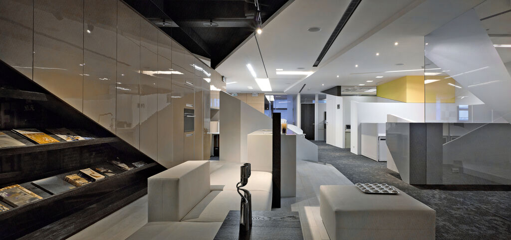 Chembridge is a supplier of high-quality industrial materials. The design of its offices is based on the structure of molecules, as well as the Fibonacci spiral of the golden ratio, in order to bring the sensual aspect of spaces to the fore. The room layout use zones of light and shade by creating and consolidating space and mass. The result is a very abstract space, which makes it possible to experience the sense and sensuality of the room.