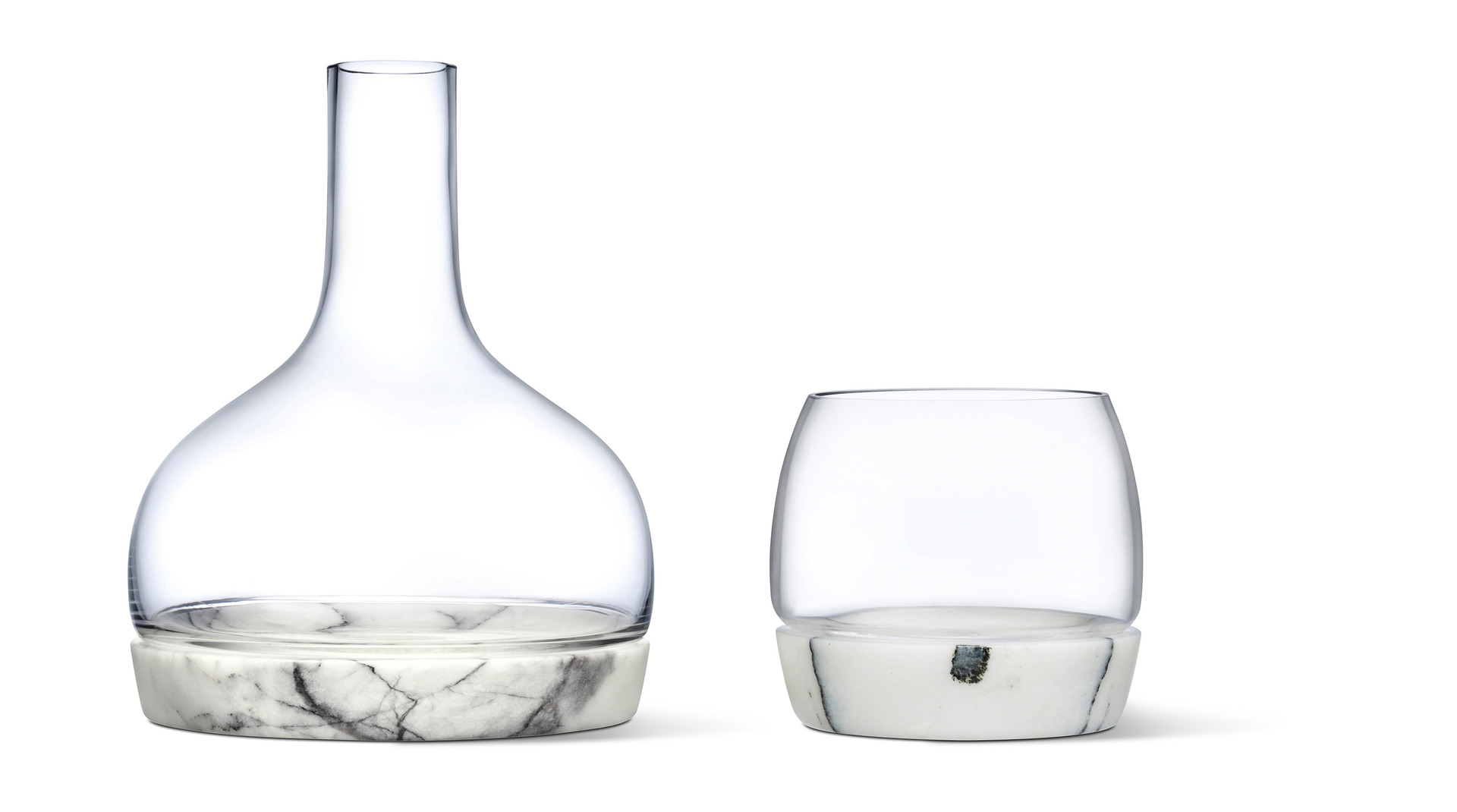 The design of the Chill whisky set was inspired by whisky on the rocks. Both the carafe and the glasses rest on precisely honed marble bases which can be cooled down individually in the freezer. Thus, whisky can be chilled and kept undiluted at the same time as there is no need for ice cubes. This method follows an old tradition of chilling whisky by adding stones which were cooled in a river. The spherical base of the carafe and the glasses lends a playful tactile feel as it invites users to swirl the glass.