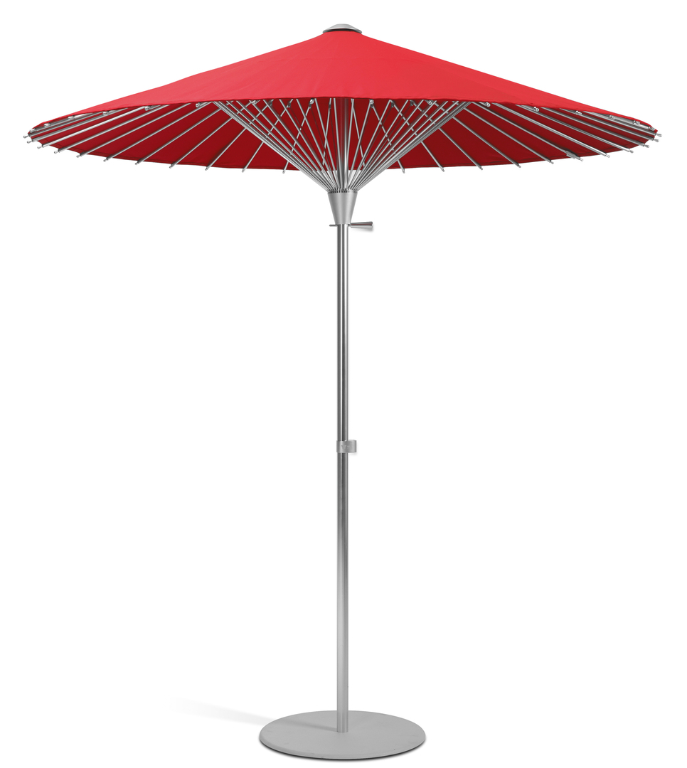 This parasol is reminiscent of traditional parasols from the ancient Chinese Qin dynasty. Its 36 ribs form a distinctive visual contrast with the fabric covering. The opening mechanism is easy to handle, maintenance-free and reliable. Especially the proportions of the centre part and the upper part are well balanced while the radius of the parasol has been deliberately limited. The high-quality anodised pole lends the overall appearance a distinctive character and is durably protected against rust.