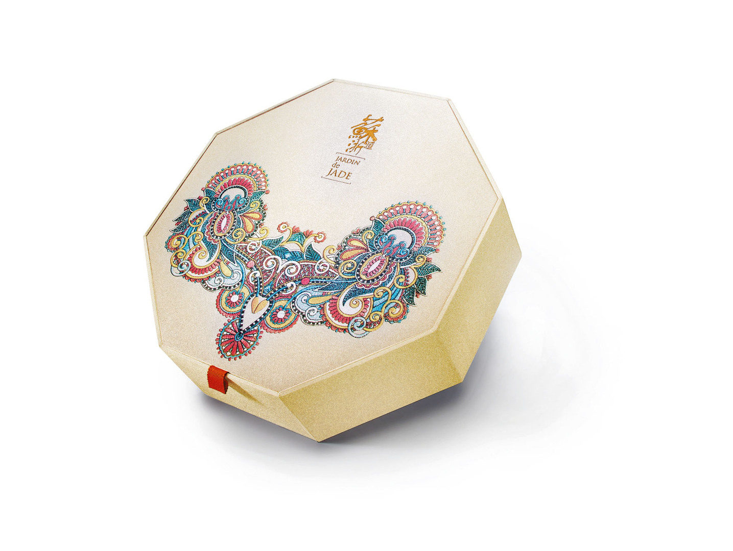 This Chinese New Year’s gift box features delicate and meticulous painting that visually conveys the exquisite beauty of classic Suzhou embroidery. Sewn on octagonal panes, the colourful patterns and shapes look like golden locking plates or phoenix coronets, thus imparting a sense of nostalgia. The inside of the box is divided into multiple compartments, prompting the consumer to continue using the gift box for storing treasured items. The golden logo and the brand name Jardin de Jade underscore the high quality of the gift.