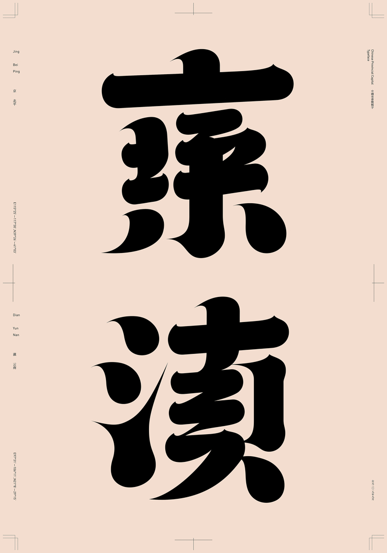 This typeface project is focused on designing Chinese monograms and exploring additional possibilities of Chinese character design based on certain aspects of recognisability. The background of the project is that the monograms abbreviating the names of Chinese provinces contain the full names of the provincial capitals. Depending on the reader’s intuition and previous reading experience, either the abbreviation or the full city name is revealed at first glance. The objective of the design is to ensure that readers, with or without knowledge of typeface design, can recognise one or more words, and to create space for the unexpected.