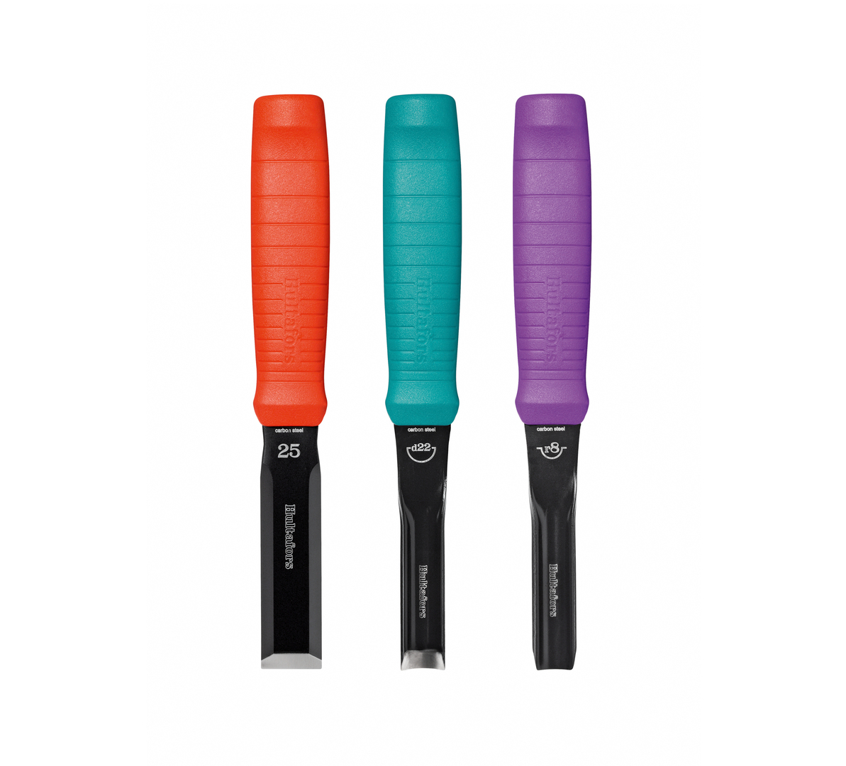 The functional, aesthetic design of the Chisels EDC is given a friendly touch by the brightly coloured handles.