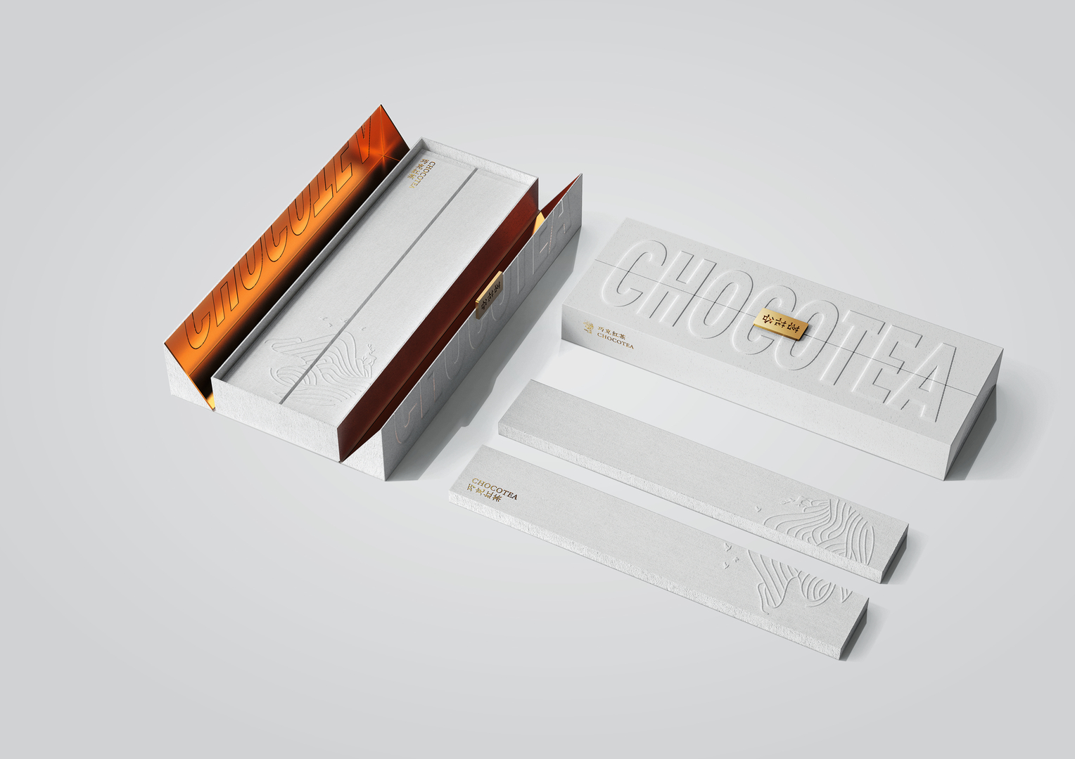The design of this packaging has a direct connection with the product. Chocotea, made according to traditional Chinese craftsmanship, is blended with the aroma of cocoa beans. The tea, conceived for a young target group, is offered as a kind of teacake in the form of a chocolate block, from which individual pieces are broken off for preparation. Accordingly, the packaging is designed like a chocolate bar. The use of two kinds of paper – special and recycled – as the main materials lends it a high-quality appearance. It can be opened in a functional manner to facilitate the breaking off of the individual pieces.