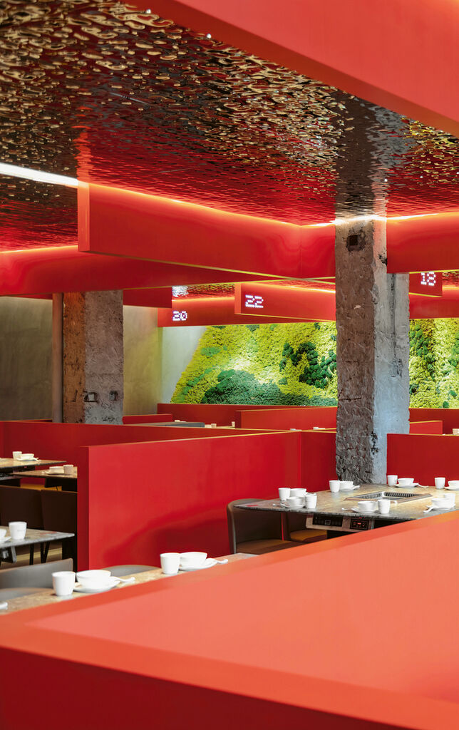 The creative concept of the Chongqing Hot Pot flagship store takes its inspiration from the salt flats on the nearby coast. In order to emulate the salt fields, the tables in the dining area are divided into squares by partitions, which gives the room a clear structure. The cement-grey colour of the walls is reminiscent of the stone baths in which the salt is recovered, while the highly reflective stainless steel panels on the ceiling show a pattern which resembles waves. Orange red is used as a visual contrast in order to make central areas stand out and to create a strong identity for the entire restaurant.