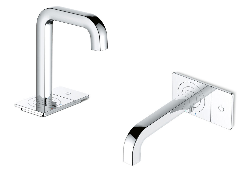 Simple geometrical forms were the source of inspiration for the design of the Chopin basin mixer. Shaped by square and rectangular elements, its foot and wall plates form the thin base for the curved water outlet. A circular controller embedded in the plate encompasses the tap and regulates the water temperature. The basin mixer easily switches on at the touch of a button.