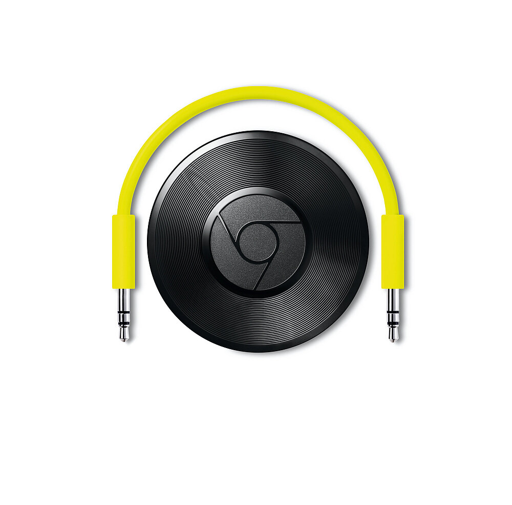 Chromecast Audio is a small device for streaming music through Wi-Fi. It connects to virtually any stereo system, bookshelf speaker, table-top radio, or desktop speaker, allowing users to listen to their favourite music via smartphone, laptop or PC on any speaker in the house. The round, puck-shaped design with delicate grooves, reminiscent of vinyl, provides easy handling. It comes with a 3.5 mm auxiliary cable that lies flat around the device and headphones.