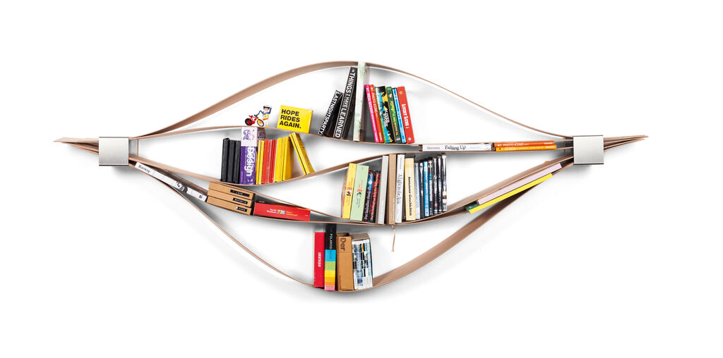 The Chuck shelving system was inspired by the idea of creating individually flexible space. This wall shelf features bendable boards and adapts flexibly to its objects. The inventive design principle consists of six thin wooden planks held together by two stainless steel collars. Chuck invites its owners to use the space in between the planks according to their taste. Depending on the number of items which are stored, the shelf stretches and alters its shape.