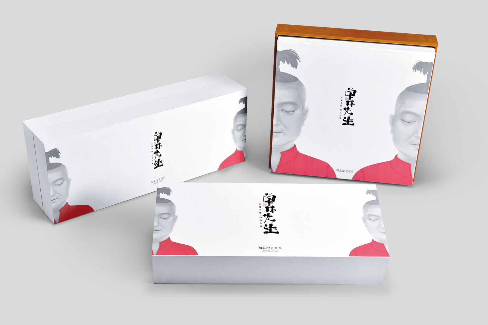 The image used in this packaging design for the tea brand Danzhu shows the figure of a Chinese Chan master and his hairstyle, combined with the pictographic depiction of a tea tree, giving it a Zen quality. The design employs painting and other expressive techniques, while materials including paper flannelette are used to create the texture of tea, bringing to life the original experience of tea culture. The techniques include hot stamping, black stamping and light oiling to appropriately reflect the brand value.