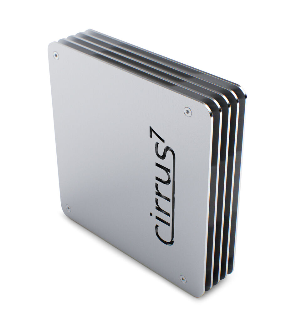 The cirrus7 nimbus is a passively cooled mini-PC which does not contain any cooling fans or other moving parts, ensuring completely silent operation. It consists of different plates of laser-cut aluminium, thus creating clear lines and contributing to its unmistakable design. The chassis itself serves as a heat sink and effectively dissipates the heat of modern multi-core CPUs. The modular construction of the chassis allows the user to add further plates to enhance cooling performance.