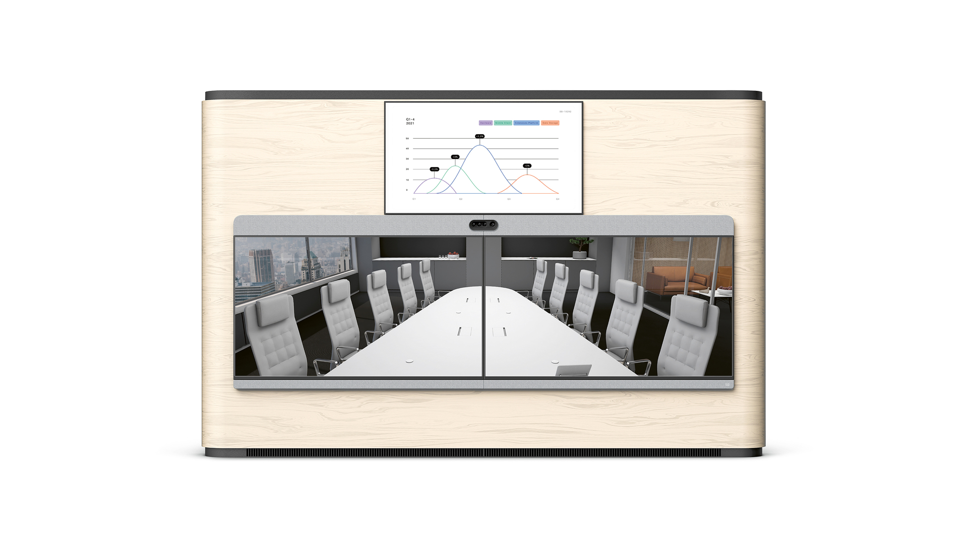 This new video collaboration system lends communicating with distant conference participants an impressively natural and immediate feel. The interactive approach offered by Cisco Webex Room Panorama is highly engaging and makes meetings more effective. The generously sized panoramic view screen enhances collaborative work. The clear language of form and unobtrusive appearance of the system are complemented by a high reliability and powerful technical features.