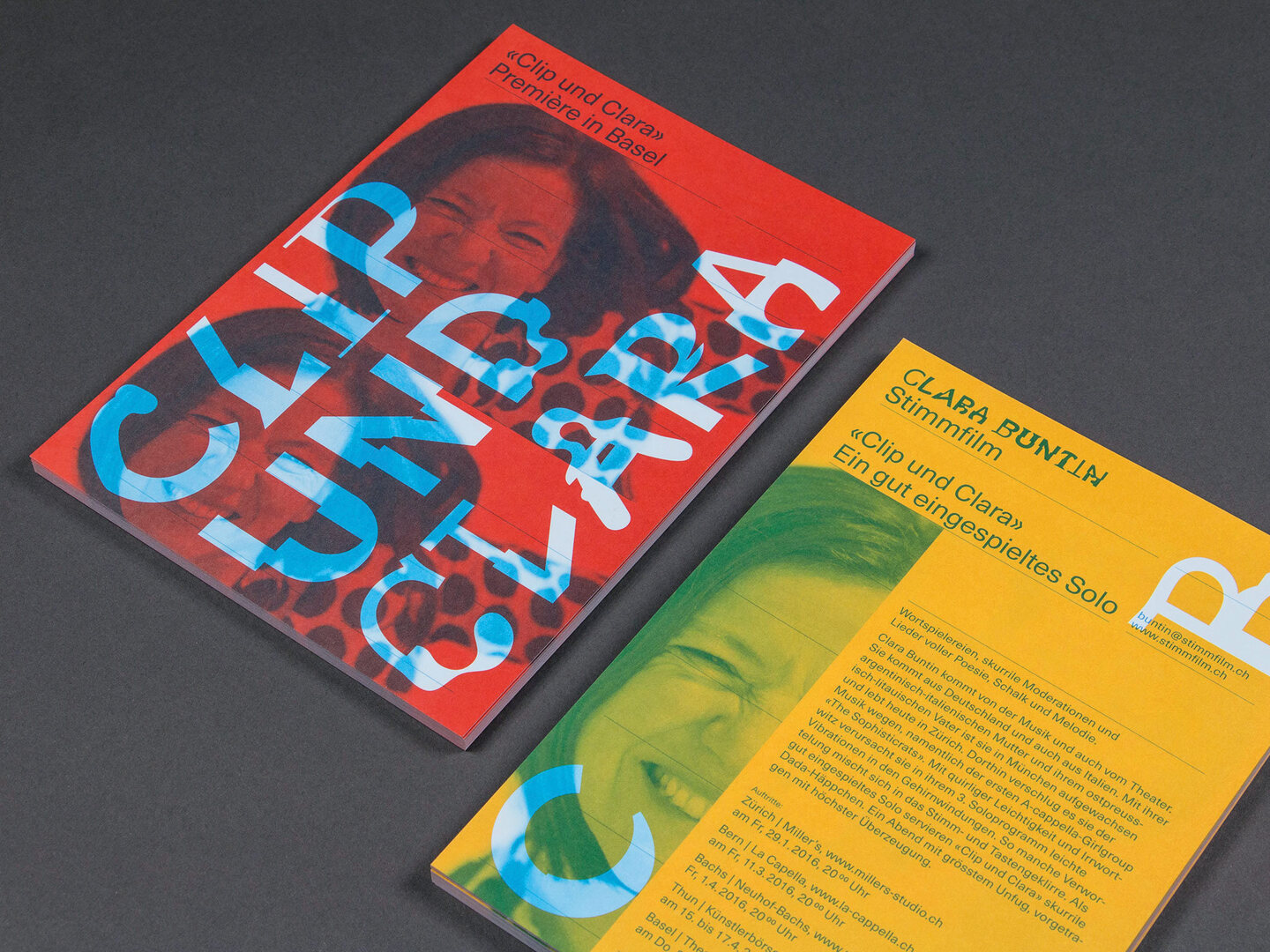 In her programme “Ich und Clara” (Me and Clara), Clara Buntin, a German-speaking artist with Italian roots, unusually presents rich wordplay and bizarre songs full of poetry. The concept of the colourful corporate identity is based on the almost schizophrenic dialogues which Clara Buntin presents in her solo programme. The aim was to visually reflect her imaginary dialogues in a flexible corporate design. For this purpose, a special font was developed that depicts the division of a typeface. In addition, Clara’s initials “C” and “B” are used in different variants.
